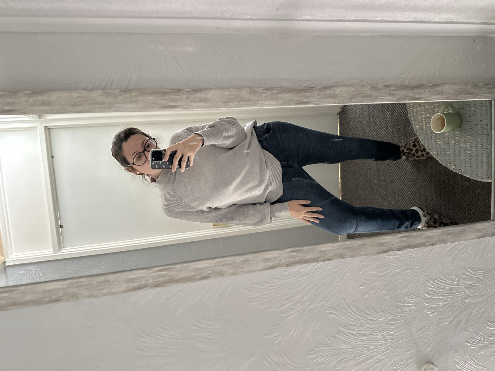 The image displays a full-length mirror selfie of a female subject inside a private residence in Macclesfield, United Kingdom. The individual wears a light grey ribbed turtleneck sweater, dark blue jeans with faint white marks, and leopard print slippers featuring white soles. She has dark hair, wears circular eyeglasses, and a ring on her left ring finger. Her right hand holds a black smartphone with a white patterned case, positioned to capture her reflection in the mirror. The background elements visible in the mirror reflection include a wall covered with light grey textured wallpaper displaying a feather-like pattern. A white door with a visible brass-colored handle is partially reflected behind the subject. The floor is covered with dark grey carpet. In the lower right corner of the reflection, a light green mug filled with a brown liquid rests on a small, round, light grey table with a woven texture.