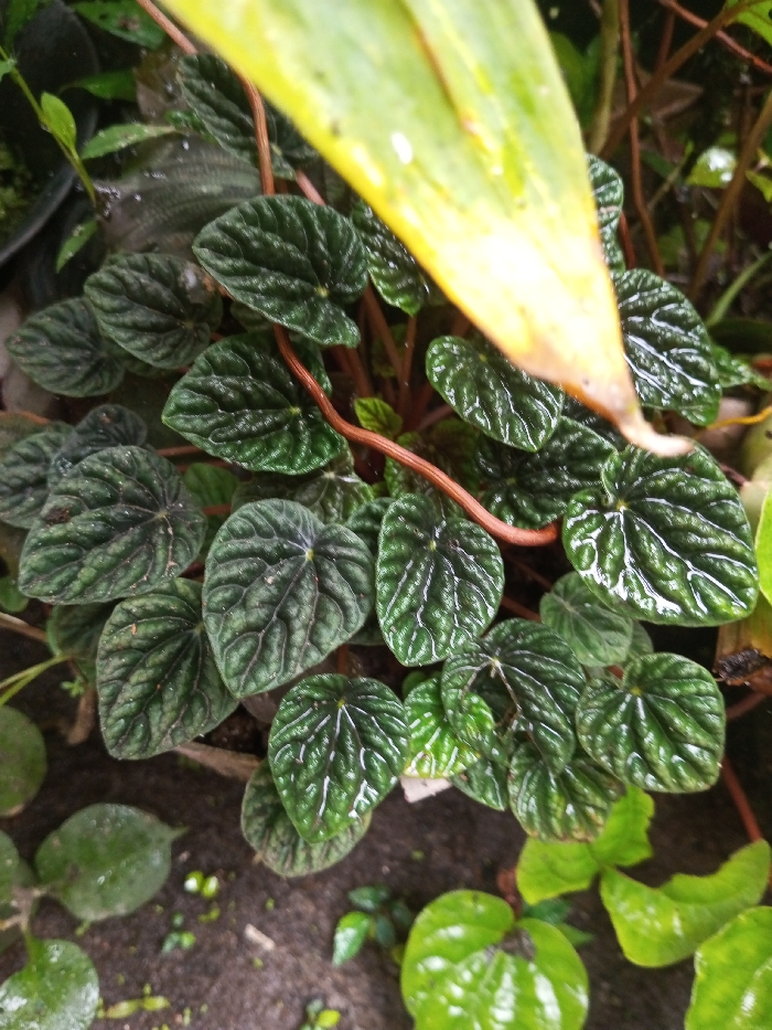 A close-up shot shows a Peperomia plant with dark green, textured, heart-shaped leaves. Water droplets glisten on the leaves, indicating recent watering or rain. A yellowing leaf is prominently featured in the foreground, blurring the view. The reddish-brown stems contrast with the foliage. Other green plants surround the peperomia, suggesting it is part of a larger garden. The ground is visible with varying shades of green.