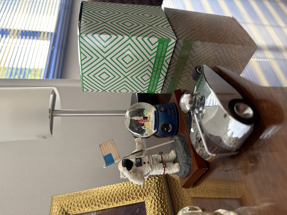 The image depicts an indoor scene on a reflective, dark brown surface, likely a polished table or desk, illuminated by natural light entering from the right. From left to right, the visible objects are: 1. A partial view of a golden, textured picture frame on the far left. 2. A white figurine of an astronaut in a space suit, saluting, holding a small American flag on a pole. The figurine stands on a dark grey base, which is mounted on a rectangular brown wooden plinth. 3. A spherical snow globe, with a blue base, featuring a rocket (resembling a Saturn V) surrounded by small flags. The base displays text identifying "KENNEDY SPACE CENTER" and graphic elements. 4. Behind the astronaut and snow globe, a white cylindrical table lamp with a silver metallic stem is present. 5. To the right, a rectangular box with a white background and a repeating green diamond pattern (concentric squares). Text on the side specifies its content as "60 TRIPLE SHEET TISSUES - NET WEIGHT 78 g - 5.5 in X 8.2 in EA. - CONTENIDO 60 PAÑUELOS TRIPLE HOJA - PESO NETO 78 g - 14 cm X 21 CM U." 6. In the foreground, below the astronaut and snow globe, a polished, chrome-plated object designed as a stylized vintage car or flask is visible. It features small black wheels and a spherical cap-like element on its upper surface, reflecting striped light. The background includes a light-colored wall and, on the far right, a window with horizontal blinds, through which sunlight casts distinct striped reflections onto the table surface and the chrome object. No individuals are present. The specific city within AMCO, Area Metropolitana Centro Occidente, Colombia, cannot be determined from the visual information provided.