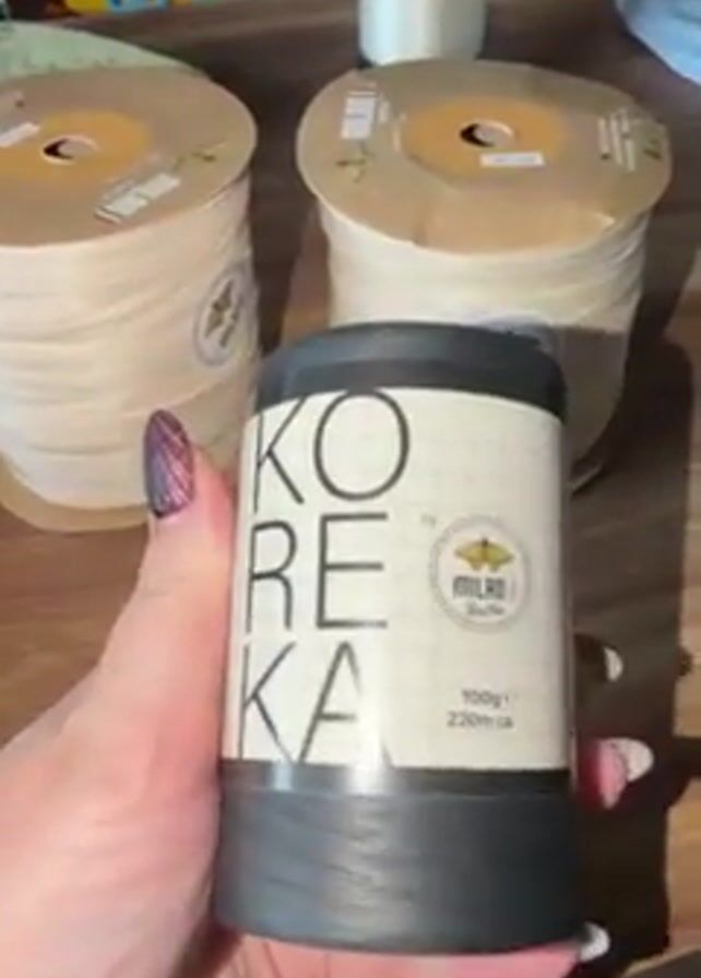 A hand with glittery purple nail polish holds up a black Koreka brand container. Behind it on a wooden table are two large spools of MILANO brand natural ribbon and one spool of clear ribbon. The hand then moves to hold up a black spool of MILANO ribbon.