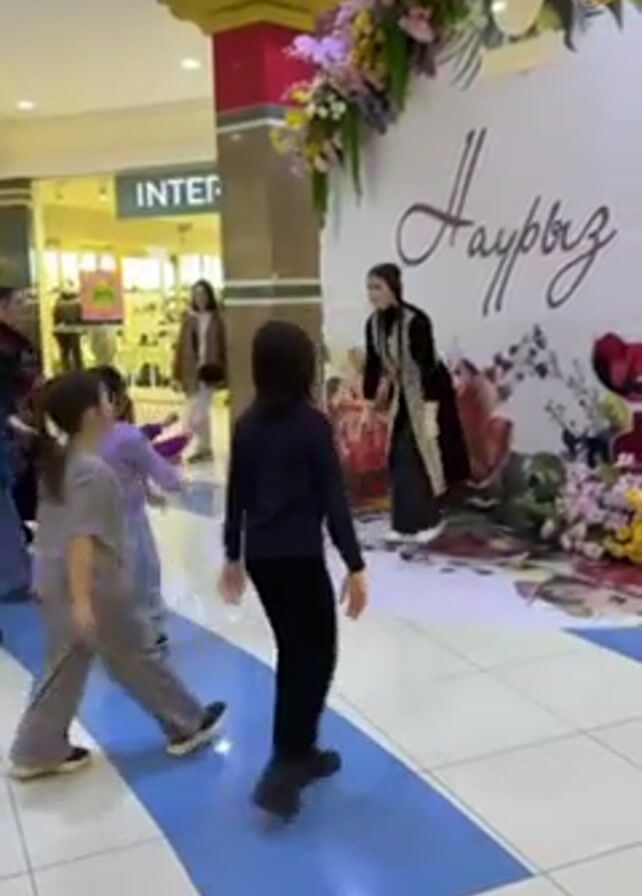 In a well-lit indoor mall area, a group of children, mostly girls, are learning a dance from an adult instructor. The instructor, a woman in traditional clothing, stands in front of a backdrop that reads "Наурыз" adorned with floral arrangements. The children, dressed in casual clothes, mimic the instructor's movements, raising their arms and stepping to the side. Mall patrons can be seen walking in the background. The floor is tiled with a blue and white pattern.