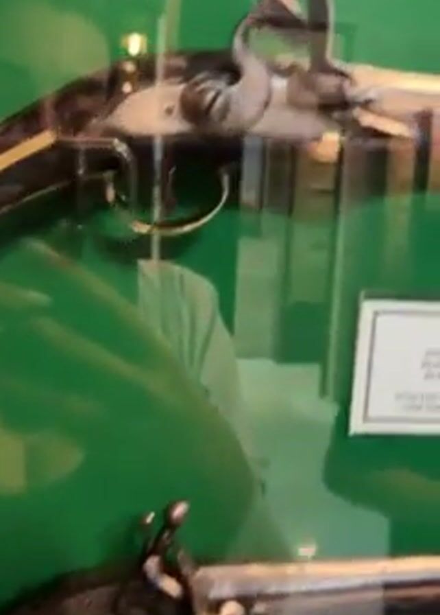 display of antique firearms inside a glass case. The case is lit with green-toned lights, creating a verdant hue on the contents and the reflection of the videographer visible on the glass. There are at least two flintlock pistols displayed in the bottom portion of the case, accompanied by a small informational card. As the camera pans upwards, the shot reveals more long rifles or muskets also displayed. The background of the display appears to be a room with green walls. The camera movement is a steady, upward pan, focusing on the firearms inside the display case.