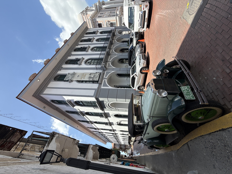 The image depicts a street scene in Casco Antiguo, Panama City, Panama, under a clear blue sky with sparse white clouds. In the foreground, positioned on the left, a vintage convertible automobile is parked. The vehicle features a light blue-green body, dark green fenders, green spoked wheels with white-walled tires, and a black soft top. Its front license plate, "1E 7930," is clearly visible, with "VENEZUELA" printed below the numbers. A yellow curb line marks the edge of the paved street. Dominating the mid-ground and extending to the right is a multi-story historic building, characterized by a white facade with grey architectural accents, including arched windows and ground-floor arches. A vertical banner is affixed to the upper section of this building, partially displaying text that includes "Conjunto Monumental del Casco Antiguo" and "Patrimonio Mundial de la Humanidad UNESCO." On the reddish-brown paver street in front of this building, several modern vehicles are parked, including a silver SUV, dark-colored SUVs, and a white commercial van. Orange traffic cones are placed near some of these vehicles. On the far left, an older, weathered building with a deteriorating wooden balcony and a black streetlamp are visible. A person wearing a blue top and red lower garment is partially visible on the sidewalk in the far left background. Another ornate, lighter-colored historic building is discernible in the distant background, to the right of the main white building. The scene is illuminated by strong sunlight, casting distinct shadows.