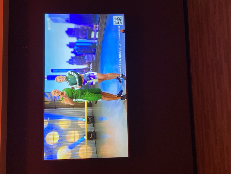 TV screen displaying an exercise program called "Basic Fit". Two people are on screen, one wearing a green outfit and the other wearing a green top and purple shorts. They stand in front of a cityscape background. The bottom part of the screen is lit up with stage lights. Text is displayed vertically on the right side of the screen in French: ".COMMENCER UN NOUVEL ENTRAINEMENT". A QR code is displayed in the upper right corner.
