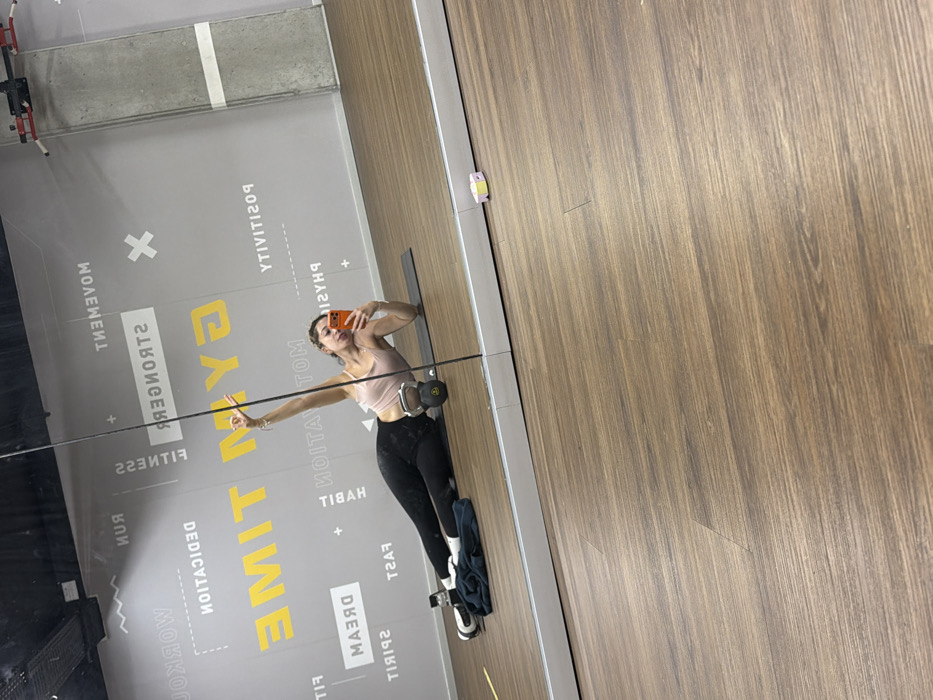 A female subject is depicted in a gym, taking a mirror selfie