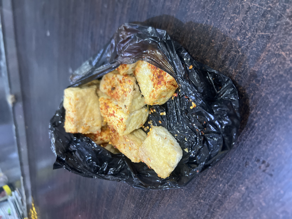 - "A pile of fried tofu cubes seasoned with chili flakes sits inside a crumpled black plastic bag" by FM-FlNel1, licensed under CC BY 4.0