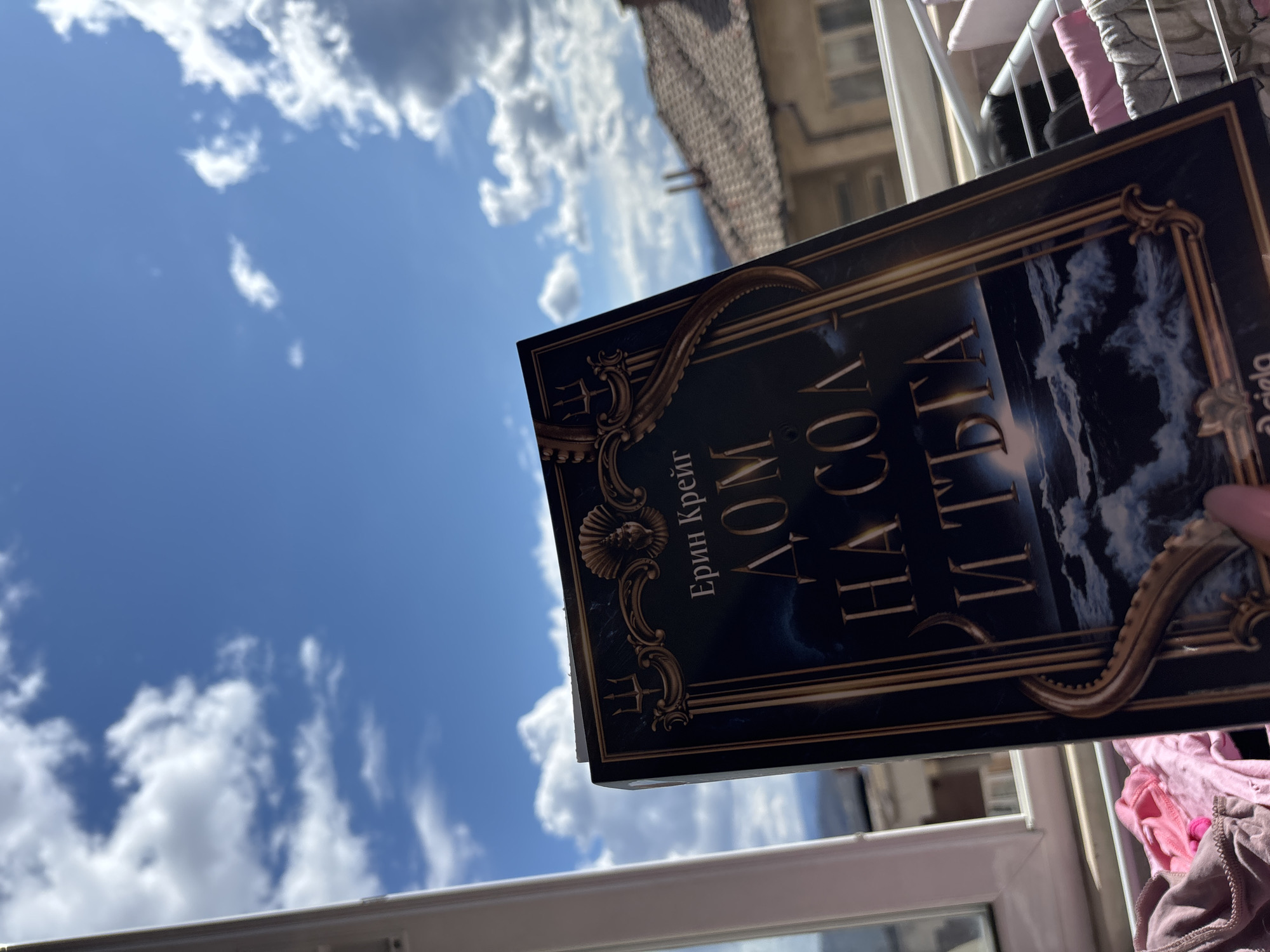 A right hand, displaying pink-painted fingernails, holds a dark-covered book positioned against an outdoor backdrop. The book's title is "ДОМ НА СОЛ И ТЪГА" (House of Salt and Sorrow) by "ЕРИН КРЕЙГ" (Erin Craig), featuring ornate gold borders, a trident emblem, and an illustration of stormy ocean waves with visible tentacles. A "ciela" publisher logo is partially visible at the bottom edge. To the left of the book, a white window frame or balcony railing is present. Below the book, a white metal drying rack supports various items of laundry, including pink and patterned garments. The background consists of a clear blue sky with scattered white cumulus clouds. Below the sky, architectural features characteristic of Veliko Tarnovo, Bulgaria, are visible: a terracotta-tiled rooftop of a building, equipped with two chimneys and constructed from light-colored material. The blurred outlines of distant hills or mountains are visible on the horizon. The scene is illuminated by daylight.