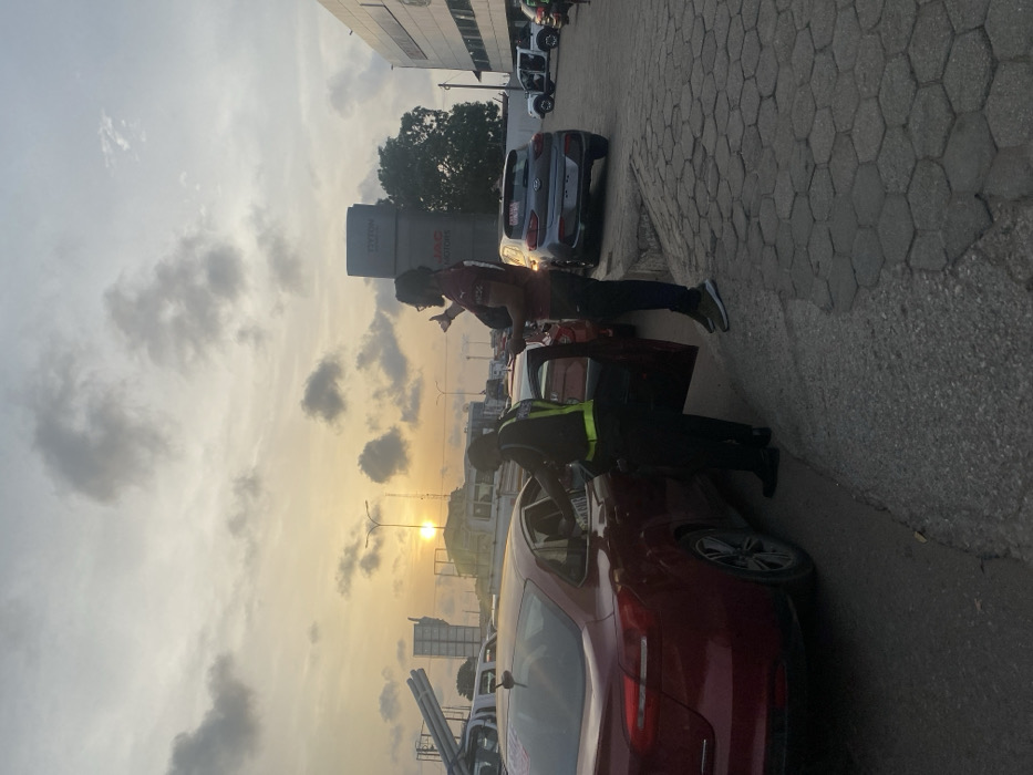 The scene is set on a street in Weija, Ghana, at coordinates 5.576 latitude and -0.253 longitude. A man in a black and yellow uniform stands beside a red Ford sedan, talking to the driver. The driver is partially visible through the open rear passenger door. Another man in a red shirt and jeans stands in the background to the right, also talking to the driver. To the right of the red sedan is a silver SUV and other vehicles are parked in the background. The sun is setting behind a cloudy sky. The ground is a gray, hexagonal-shaped pavement.