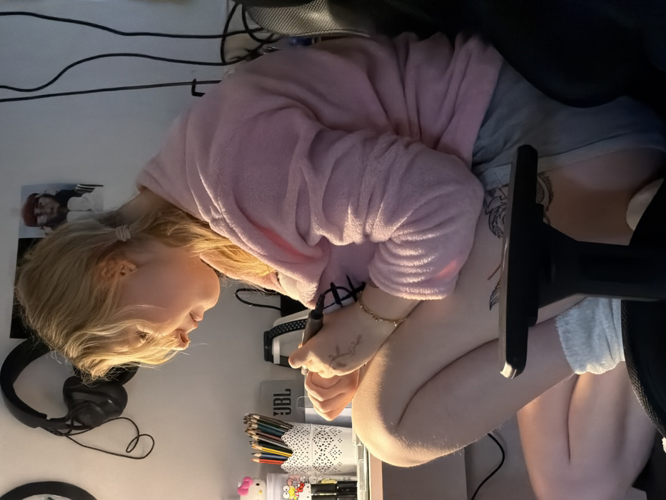 The image depicts an indoor scene in Trassem, Germany, featuring a blonde individual, likely female, seated at a light-colored desk. The person wears a pink, fuzzy long-sleeved top and light grey shorts, with white socks. A dark tattoo is visible on the upper left thigh, and a lighter marking, possibly a temporary tattoo or drawing, is present on the back of the right hand. A gold-colored bracelet adorns the right wrist. The individual is focused intently on their hands, holding a dark, pen-like tool with a visible cord in their right hand, directing it towards their left hand, suggesting a detailed manual activity such as nail care or crafting. The desk area is illuminated by a light source positioned to the left and displays a white cup containing multiple colored pencils, a small Hello Kitty figurine, another small figurine with red and yellow accents, a silver JBL brand speaker, and a dark smartwatch. In the background, a white wall exhibits black over-ear headphones hanging, a framed or pinned picture of an individual wearing a red hat, and several dark electrical cables running vertically.