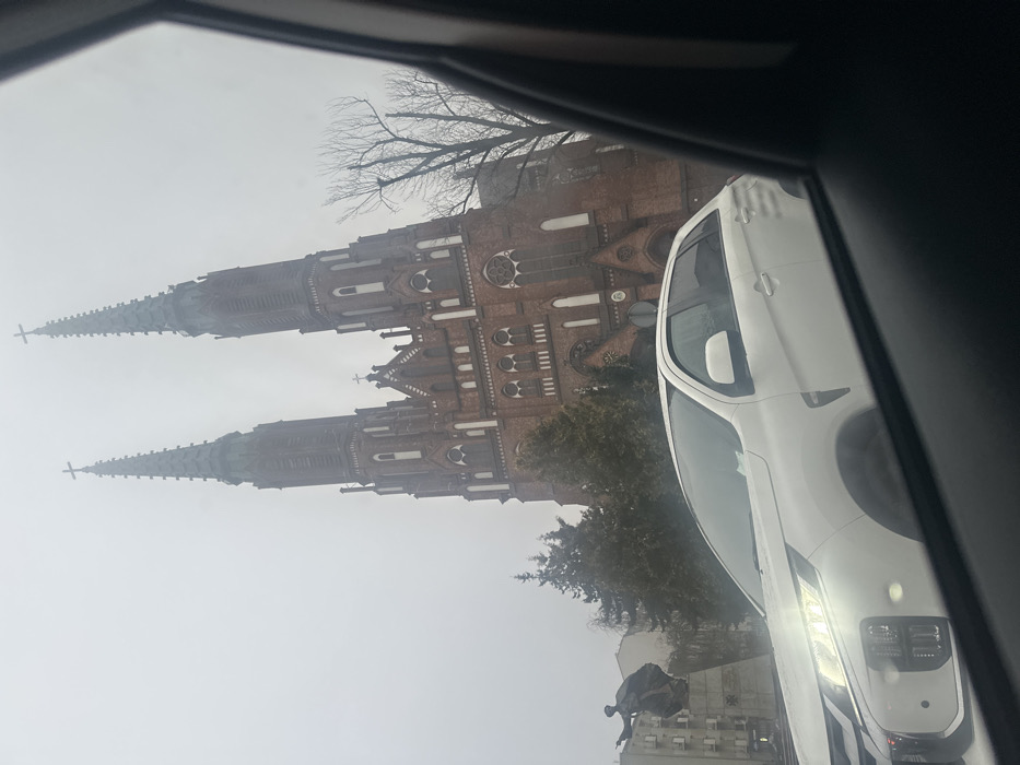 The image depicts a street scene in Warsaw, Poland, specifically on Floriańska Street in the Praga-Północ district. The dominant subject is the St. Florian's Cathedral, a large red-brick Neo-Gothic church with two prominent spires, each topped with a cross. The church facade features multiple arched windows, decorative elements, and buttresses. The upper portions of the spires appear partially obscured by an overcast, hazy, or foggy sky, which is uniformly gray. In the mid-ground, a white SUV, consistent with a Mitsubishi ASX or Outlander Sport model, is positioned diagonally, facing towards the left. Its headlights are illuminated. The vehicle appears to be on a road or stopped at an intersection. Parts of the image on the right and bottom edges are obscured by the interior frame of a vehicle, indicating the photograph was taken from inside a car looking out. To the left of the church and behind the white SUV, a bronze-colored statue on a stone pedestal is visible. This is the Monument to the Praga Defenders, depicting a figure with an outstretched arm. Several trees are present; some are bare deciduous trees, while others are dark green conifers positioned in front of the cathedral. Faintly visible in the far left background are multi-story residential buildings. No human figures are clearly discernible. The overall lighting suggests a dim daylight condition.