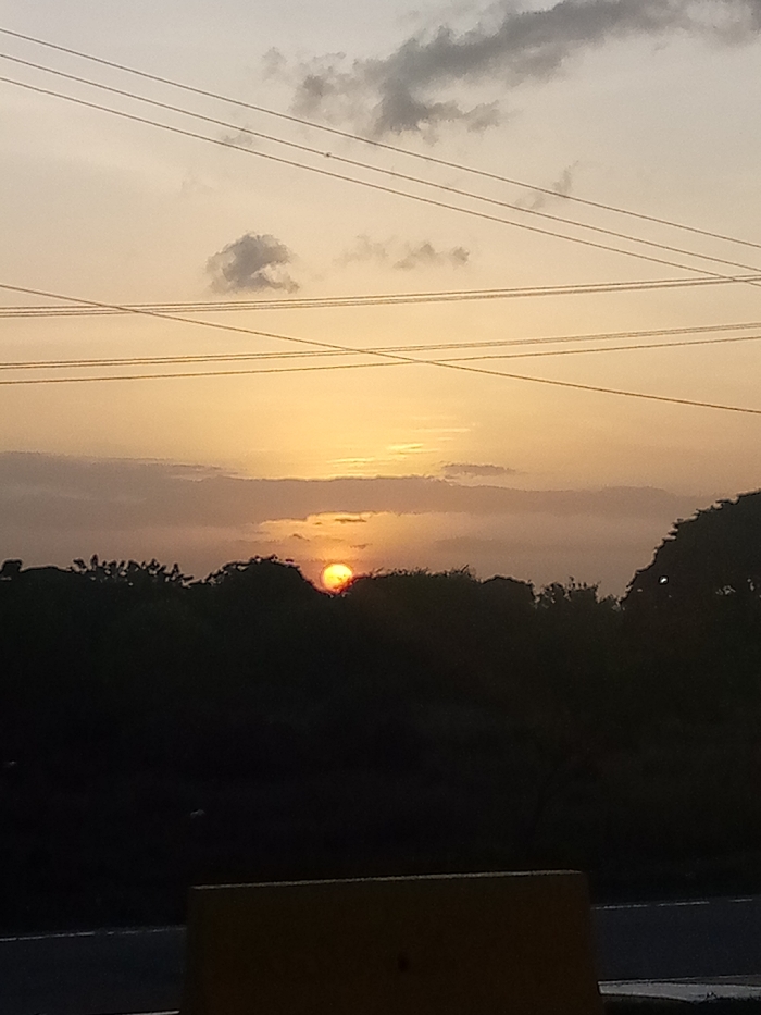 A hazy sunset sky transitions from pale yellow near the horizon to a muted peach above. Thin, dark clouds dot the sky. Silhouetted trees line the horizon where the sun is setting, appearing as a bright orange orb partially hidden behind the foliage. Power lines crisscross the upper part of the frame. In the foreground, a concrete barrier or curb is visible, suggesting an elevated viewpoint, possibly from a bridge or building.