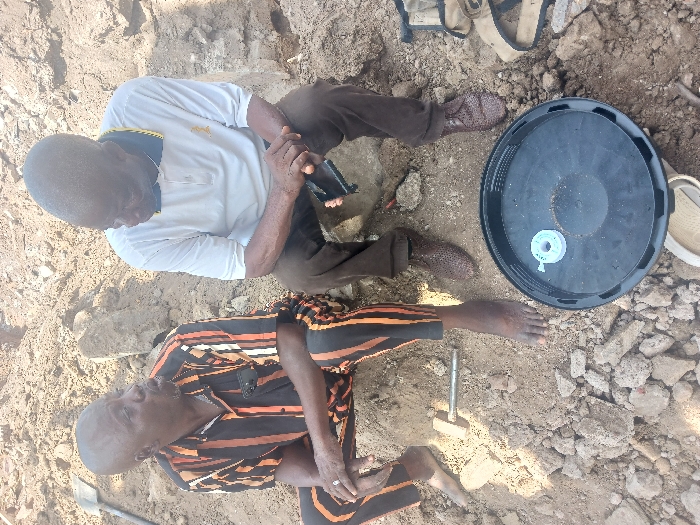 The image displays two adult males seated on dry, debris-strewn ground in Lokoja, Nigeria. The male on the left, barefoot and dressed in an orange, black, and beige striped short-sleeved shirt with matching trousers, is speaking with his mouth open, facing the male on the right. A ring is visible on his left ring finger. A small sledgehammer rests on the ground near his feet, and the blade of a shovel is partially visible in the background. The male on the right, wearing a white polo shirt with a dark collar, dark brown trousers, and dark brown woven slip-on shoes, is seated observing, with his hands clasped in front of him. A dark mobile phone is held near his hands. Centered in the foreground is a round black plastic tray containing a small spool of light-colored solder wire and several minute metallic flecks. Partially visible light-colored sandals are positioned directly below the tray. The ground consists of loose soil, gravel, and fragmented concrete/rock debris, indicative of an outdoor work or excavation environment.