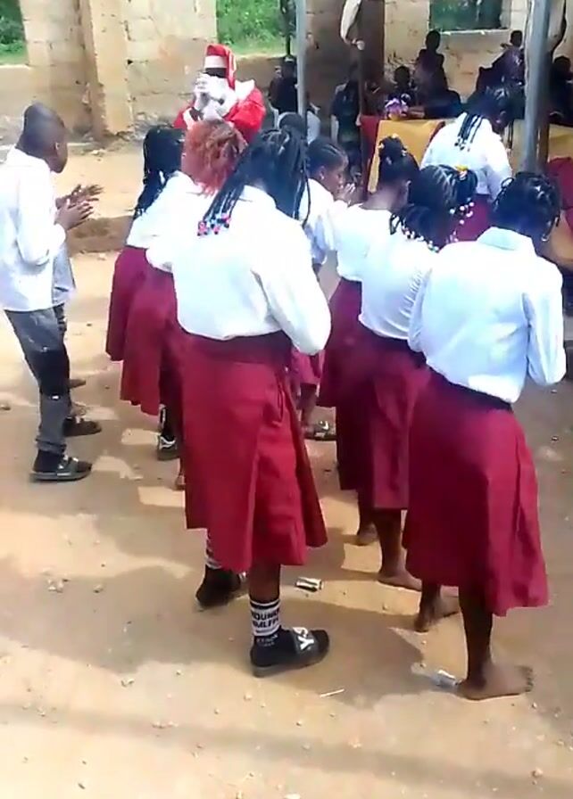 A group of children in what appears to be school uniforms are dancing outside in a dusty area. The girls are wearing white shirts and maroon skirts, some with shoes or sandals and some barefoot. A boy is standing on the left, clapping his hands. In the background, someone dressed as Santa Claus is visible under a white canopy, where other people are seated. The buildings in the background appear to be simple, possibly under construction or unfinished. The overall atmosphere seems celebratory.