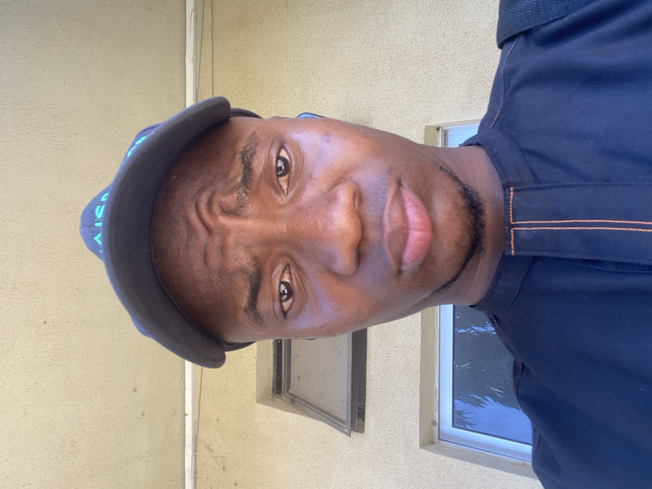 A close-up, head-and-shoulders portrait of a young adult male is depicted. The individual has a dark complexion, dark eyes, and a slight goatee. He wears a dark blue baseball cap with partially visible light blue or green text ("AIS" is discernible) and a dark blue or black tunic-style garment with a Mandarin collar and orange stitching detail on the placket. A blue earbud is visible in his right ear. His eyebrows are furrowed, creating a prominent vertical crease between them, and his lips are closed. The background consists of a light tan or beige exterior wall, likely stucco or painted concrete. Two windows are visible on the wall. The upper window, located behind and to the left of the subject, is partially open with its bottom edge tilted inward, framed in a dark material. The lower window, largely obscured by the subject, has a lighter frame and reflects a blue hue, possibly sky or foliage. The lighting suggests an outdoor environment. The scene is located in the city of Minna, Nigeria.