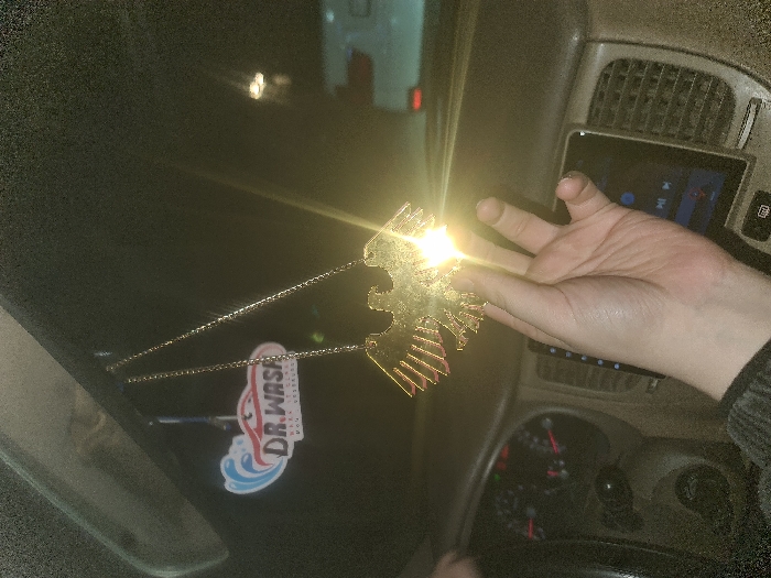 Inside a car, a hand holds a golden eagle pendant illuminated by bright light