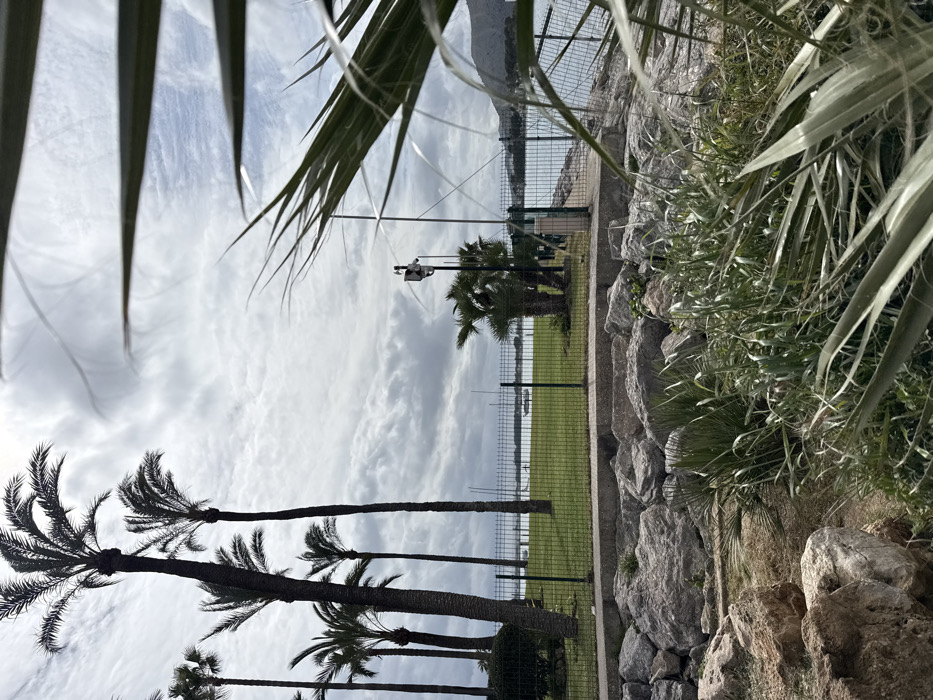 An outdoor scene in Alcúdia, Spain, depicts a coastal landscape under an overcast sky. The foreground features a rocky embankment with sparse green and brown vegetation, including prominent out-of-focus palm fronds on the right. Directly behind the rocks is a concrete ledge or path, separating the embankment from a manicured green lawn. A green metal fence with a gate traverses the middle ground, enclosing the lawn area. Numerous tall, slender palm trees with dark trunks are positioned throughout this grassy expanse, particularly clustered on the left. To the right, within the fenced area, a utility pole or lamppost supports a white camera or sensor device, alongside a smaller cluster of palm trees. Beyond the fence, a calm, light blue-grey body of water (presumably a bay or sea) extends across the background. Several vessels are visible on the water, appearing as dark shapes, with one lighter-colored boat positioned on the left. The distant horizon on the right reveals dark, undulating landforms or mountains. The sky is largely obscured by dense, light grey to dark grey clouds. No individuals or animals are present.