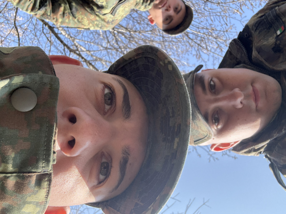 Three individuals in military camouflage uniforms and headwear are depicted in a low-angle, upward-looking photograph under a clear blue sky. The closest individual, positioned at the top of the frame, wears a camouflage boonie hat, with their forehead, eyes, and nose visible as they look directly at the camera. Below and to the left, a second individual, a male, wears a camouflage cap and jacket, displaying a Bulgarian flag patch on his right shoulder. He is also looking directly at the camera. To the right and slightly behind the first individual, a third individual, also wearing camouflage and a cap, has their upper face visible, looking towards the camera. The background consists of a bright blue sky and numerous bare tree branches, indicating an outdoor, deciduous environment in late autumn, winter, or early spring. The scene is located within Sofia, Bulgaria, in an unspecified park or wooded area.