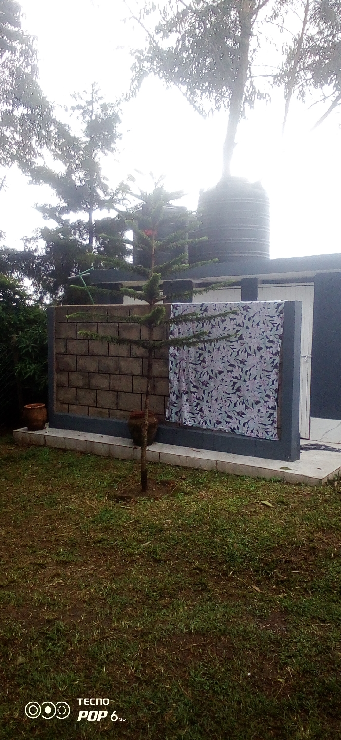 The image displays an outdoor residential or garden scene in Unknown, Unknown. The foreground features patchy green grass with visible soil. In the mid-ground, a slender young conifer tree stands before a low structure. This structure consists of a gray concrete block wall section on the left, transitioning to a dark gray painted base. A patterned white/light blue textile with dark green/purple leaf motifs is draped over the dark gray wall section. To the right, a white door with a dark frame is set into a dark gray wall. Two terracotta pots are positioned at the base of the wall. Above the structure, a large, dark cylindrical water tank is visible on a rooftop. Multiple large trees with dense foliage are silhouetted against a bright, overcast sky in the background. No people are present.