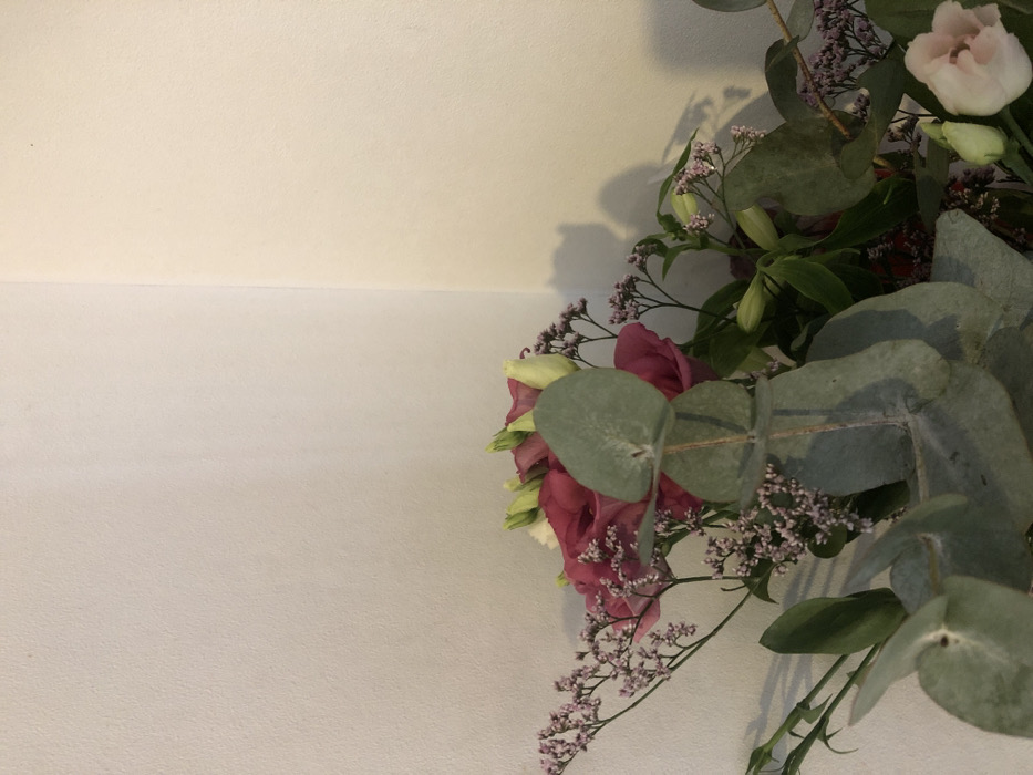 The image displays a close-up, static shot of a floral arrangement positioned within an interior corner in Saverne, France. The background consists of two adjoining walls meeting at a vertical seam. The left wall is a light off-white or pale beige, exhibiting a textured finish. The right wall is a slightly warmer, cream-colored hue, also textured. The floral arrangement occupies the lower two-thirds of the frame. It features multiple deep pink to magenta-colored flowers, some fully bloomed with ruffled petals, others as tightly closed buds. Lighter, pale pink or almost white buds are visible in the lower right. Interspersed throughout are clusters of smaller, delicate purple-pink filler flowers, characterized by numerous tiny blooms on thin stems. Prominent in the foreground and center are several large, rounded, blue-green eucalyptus leaves. Other green foliage is also present, supporting the flowers. Light enters from the upper left, illuminating the arrangement and casting soft shadows onto the right wall. Distinct shadows of the flowers and foliage are visible on the cream-colored wall, creating depth behind the botanical subjects. No individuals or actions are depicted.
