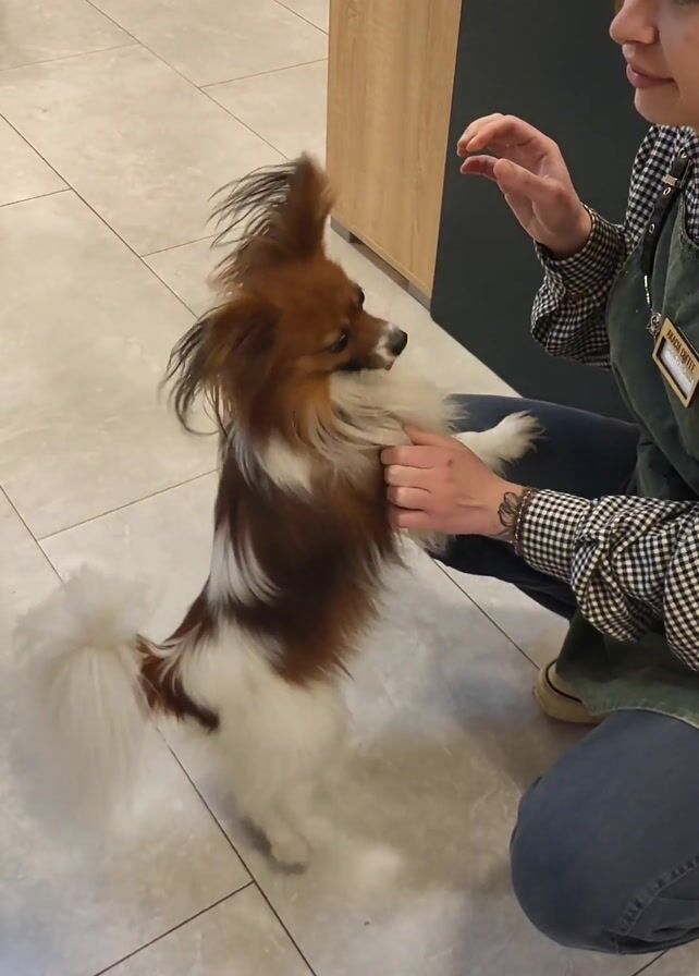 A person is kneeling on a tiled floor, interacting with a small, brown and white dog. The dog is standing on its hind legs, reaching up to the person who is holding a small treat. The person is wearing a plaid shirt, dark jeans, and a green apron with a name tag. The dog appears to be a Papillon breed. The tiled floor is light gray. A wooden panel is visible in the background. The scene seems to be taking place indoors, possibly in a store or service area.