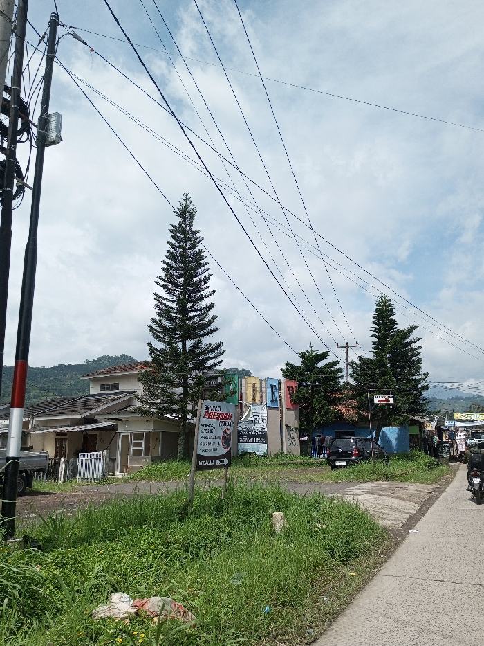 This image depicts an outdoor street scene within the city of Ariyalai, Sri Lanka, observed from a low angle. The foreground features an area of overgrown green grass and weeds on the left, with a light-colored object, possibly a discarded bag or cloth, partially visible among the vegetation. To the right, a cracked, light grey concrete pathway or road extends into the midground. A dark-colored motorcycle is partially visible on the far right edge of the frame, facing away from the viewer. In the midground, a prominent black utility pole with red and white banding is situated on the far left, supporting numerous overhead wires that crisscross the sky. Adjacent to the pole, a large, tall conifer tree with dense green foliage stands vertically. To its left, a light-colored, multi-story residential building with a reddish-brown tiled roof is visible, along with a smaller, single-story structure in front of it. A large, rectangular sign, predominantly black and white with text in what appears to be Indonesian ("ELEVATOR PRESSAN KOTIA", "MEDAN JAYA"), is positioned near the center. Behind this sign, multiple colorful banners or advertisements are affixed to vertical structures. To the right of the sign, another conifer tree is present. A dark-colored hatchback car is parked on unpaved ground next to a small building painted blue. Further down the road, more indistinct buildings, signs, and additional utility poles are visible, along with what appears to be another motorcycle or scooter. The background consists of green, undulating hills or mountains under a partly cloudy sky, with patches of blue visible between the white clouds. The entire scene is characterized by dense overhead electrical or communication wires spanning across the upper portion of the frame. No individuals are clearly discernible.