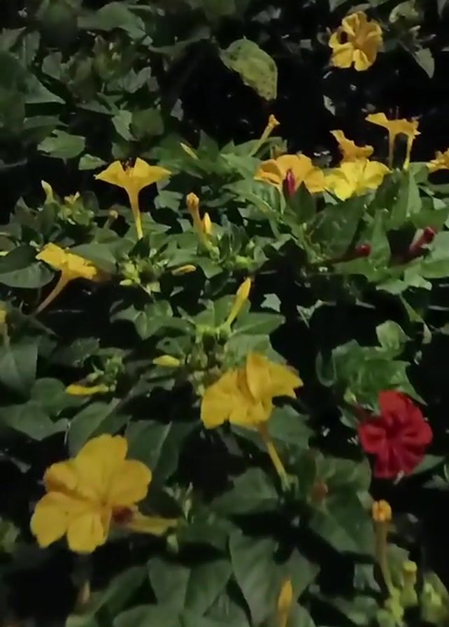 bush with mostly yellow, trumpet-shaped flowers, interspersed with one red flower. The leaves are dark green. The video is taken at night.