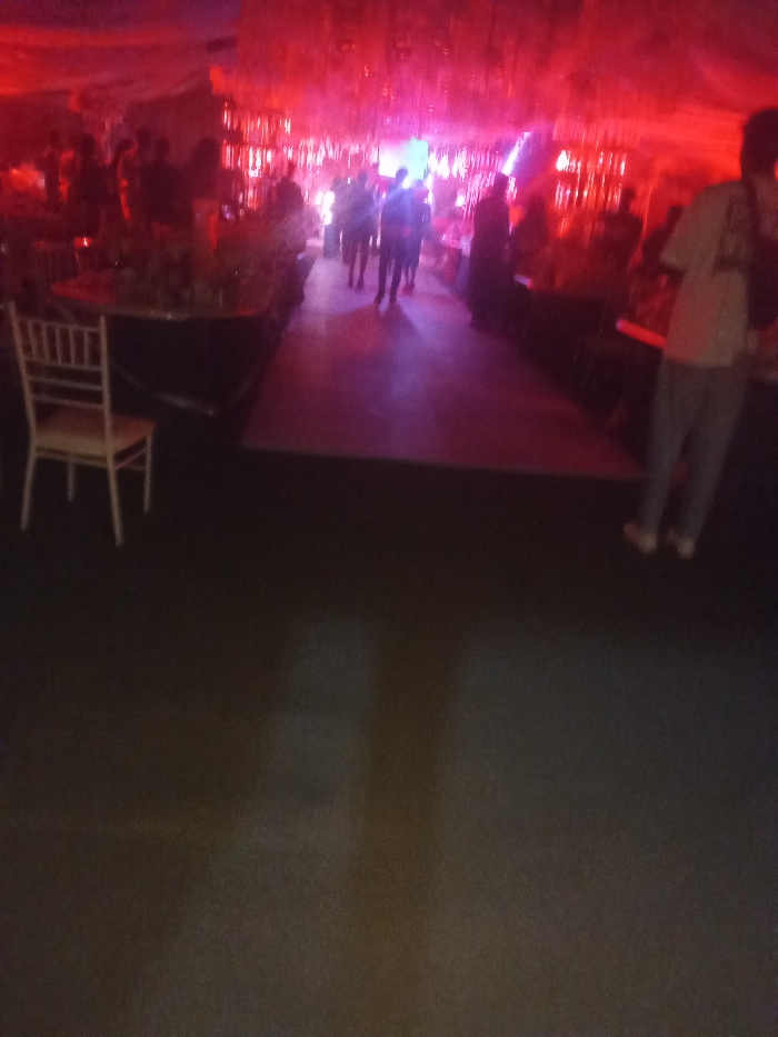 A crowded indoor space lit with red hues, possibly a party or event. Tables with floral decorations line both sides of a walkway. Several people are walking towards the back. A lone white chair sits on the left near the front. A person stands on the right with a light-colored shirt and jeans. The foreground is a dark, shadowy floor.