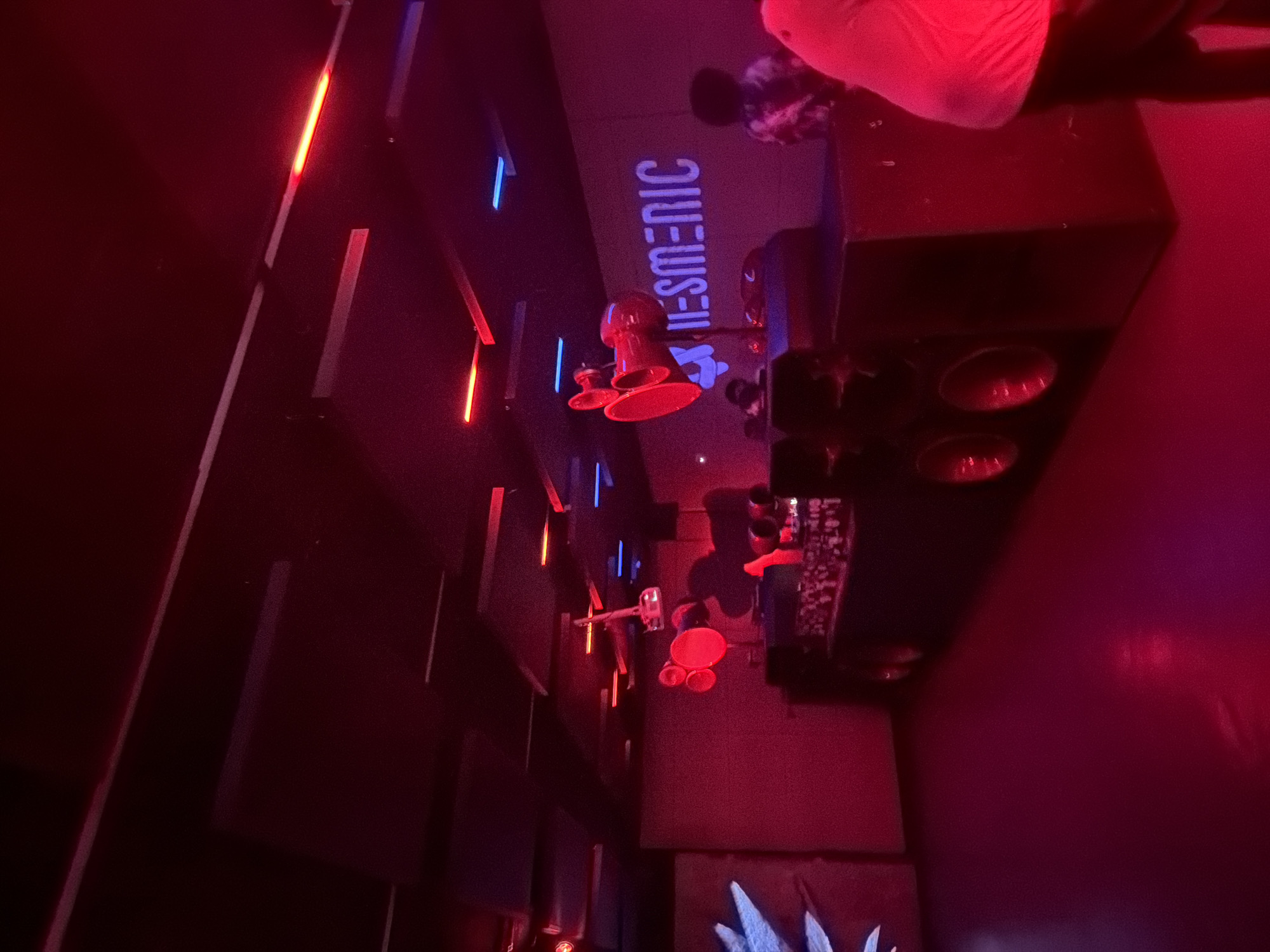 The image depicts a dimly lit interior space with red and blue neon lighting