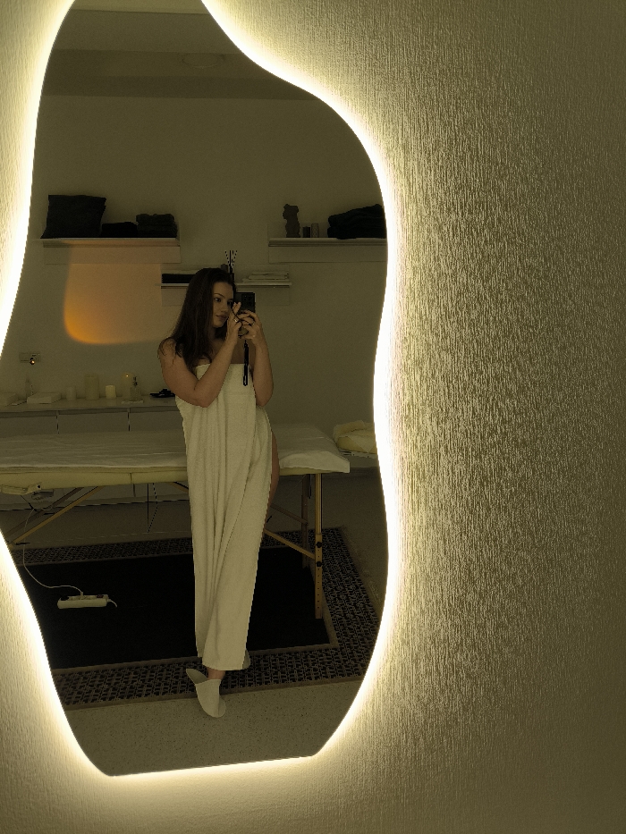 A woman wrapped in a white towel stands in front of a uniquely shaped mirror. The mirror is framed with bright lights. She's holding a smartphone, seemingly taking a selfie. Behind her, a massage table is visible, and shelves with various items line the wall. The room is bathed in a warm, yellowish light. The mirror's reflective surface captures the details of the scene.