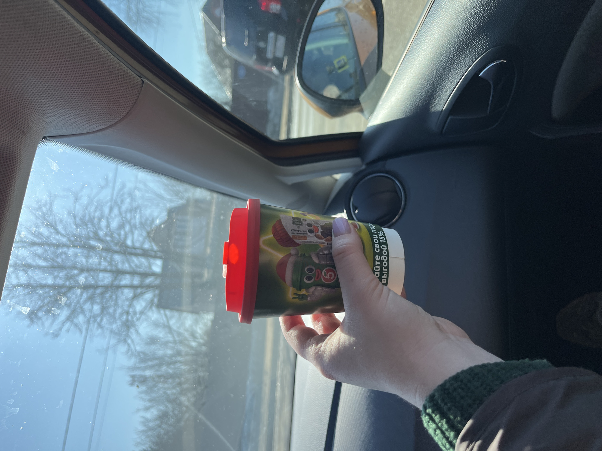 An image captured from the interior of a vehicle, in Yasenevo, Russia, displays a sunlit street scene. A person's right hand, with light skin tone and a light purple fingernail, holds a dark green disposable cup with a red lid in the foreground. The cup is adorned with cartoon figures, including a green character wearing a Santa hat and displaying a peace sign, marked with a white '5', and partially visible Cyrillic text on a white band: "айте свои пар выгодoй 15%". The individual wears a dark brown jacket with a green knitted cuff. The vehicle's dark grey dashboard and door panel are visible, along with an orange/brown side mirror reflecting a yellow object or sign marked '13'. Through the windshield, a clear blue sky with intense sunlight creates glare. Bare deciduous trees, overhead power lines, and a residential building with a pitched roof are visible in the background. A dark-colored SUV is parked or moving behind and to the right of the observer's vehicle.