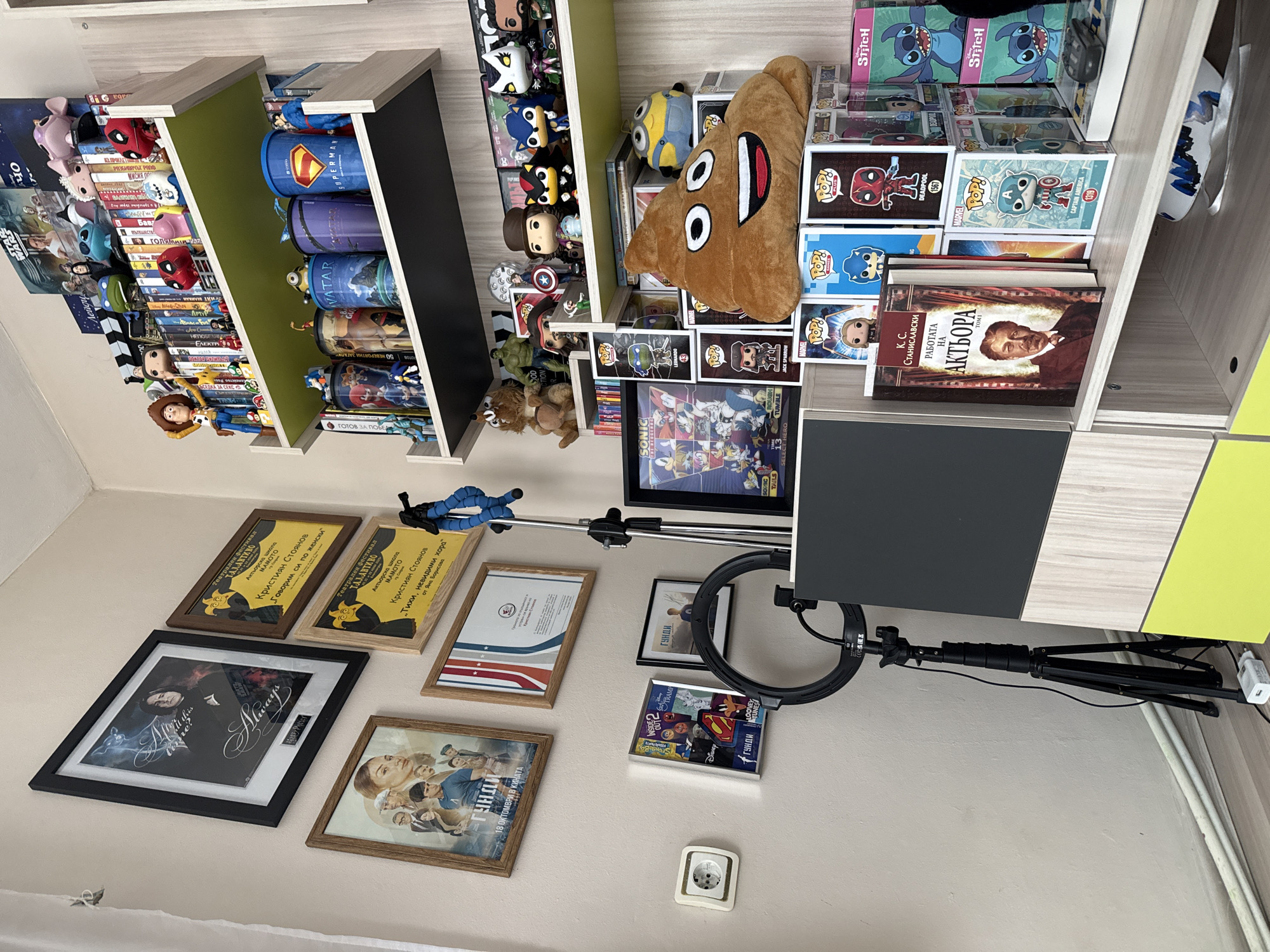 This is a medium shot of a room corner featuring a bookshelf and a wall decorated with framed items. The bookshelf is filled with various items, including plush toys, movies, and Funko Pop figures. Among the items are a poop emoji plush, Superman and Minions-themed cups, and books. The wall is adorned with multiple framed items, including photographs, certificates, and posters. Notably, there's a Harry Potter-themed piece with the word "Always." A ring light attached to a tripod stands in front of the wall. The scene appears to be in a domestic setting, indicating the personal collection and interests of the occupant. Location information such as Kostenets, Bulgaria is not evident in the image, and cannot be validated.