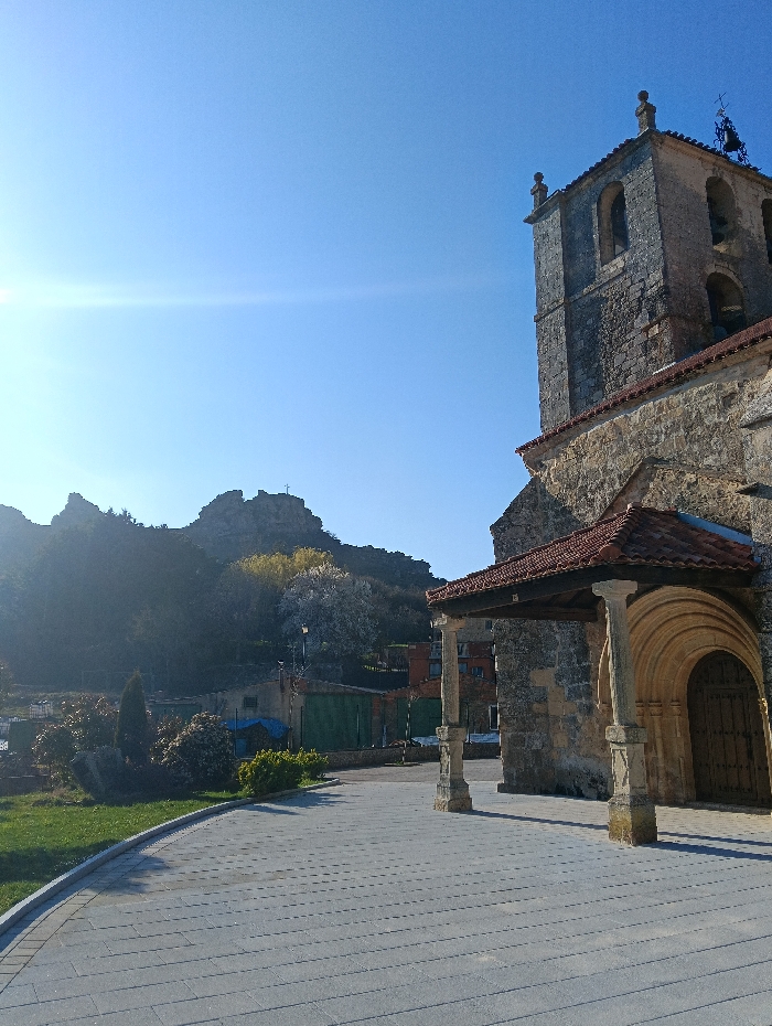 This image depicts an exterior view of a stone church in Montorio, Spain, under a clear blue sky. The church, constructed from large, irregular stone blocks, occupies the right side of the frame. It features a prominent bell tower with two levels of arched openings housing bells, topped by decorative stone finials. A tiled, reddish-brown roof covers the bell tower and a portico extending over the main arched entrance on the church's side, supported by two robust stone pillars. In the foreground, a paved plaza or courtyard, comprised of rectangular grey pavers, extends from the bottom of the frame, curving towards the left. Adjacent to this paving, on the left, is a manicured grassy area containing several shrubs and small evergreen trees. The background is dominated by a rugged, rocky mountain or hill range, partially illuminated by the sun. A small cross is visible on the highest peak of this formation. Below the hill and behind the grassy area, a few smaller structures with dark green garage-style doors and a building partially obscured by a blue tarp are visible. Several trees, one with white blossoms and another with lighter yellow-green foliage, are also present in the midground against the hillside. The scene is brightly lit by direct sunlight, evidenced by a lens flare in the upper left corner and distinct shadows cast by the church portico pillars onto the paved ground. No individuals are visible in the frame.