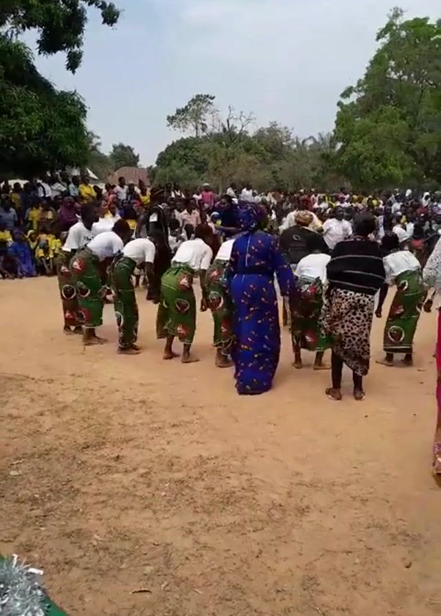 The video captures a cultural dance performance taking place outdoors in front of a large crowd. A group of approximately nine women, mostly wearing white tops and matching green patterned skirts, are performing a synchronized dance. Other women and men are in the group of dancers too, dressed in colorful and patterned clothing. The dance appears to involve swaying and bending motions. The background is a dusty, open area with a crowd of spectators seated and standing around the perimeter. Trees and other vegetation are visible in the background. A table decorated with silver tinsel is visible in the lower left corner. The sky is overcast with light blue patches. There are trees surrounding the location and people of all ages in the crowd.