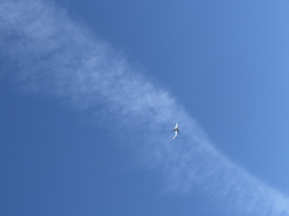 The scene displays a clear blue sky over Leiden, Netherlands. A single commercial aircraft, predominantly white with light blue markings on its tail and fuselage, is observed flying horizontally from left to right in the mid-left portion of the frame. A faint, elongated, wispy cloud formation, consistent with a dissipating contrail, extends diagonally across the sky from the upper-left corner towards the lower-right corner, passing behind the aircraft. The sky otherwise appears unblemished, indicating daylight conditions. No other objects or individuals are visible.
