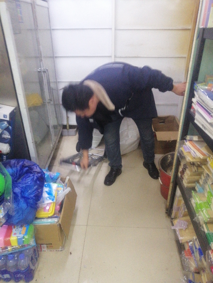 In a cluttered storage room, a man in a dark blue jacket and jeans bends over, picking up a small metal frame from the tiled floor. Behind him, against a wall, stands a closed glass cabinet to the left, and to the right is a tall shelf filled with merchandise. In front, stacked cardboard boxes overflow with colorful packages, bottles of water, and a large blue plastic bag, adding to the confined and disorganized space.