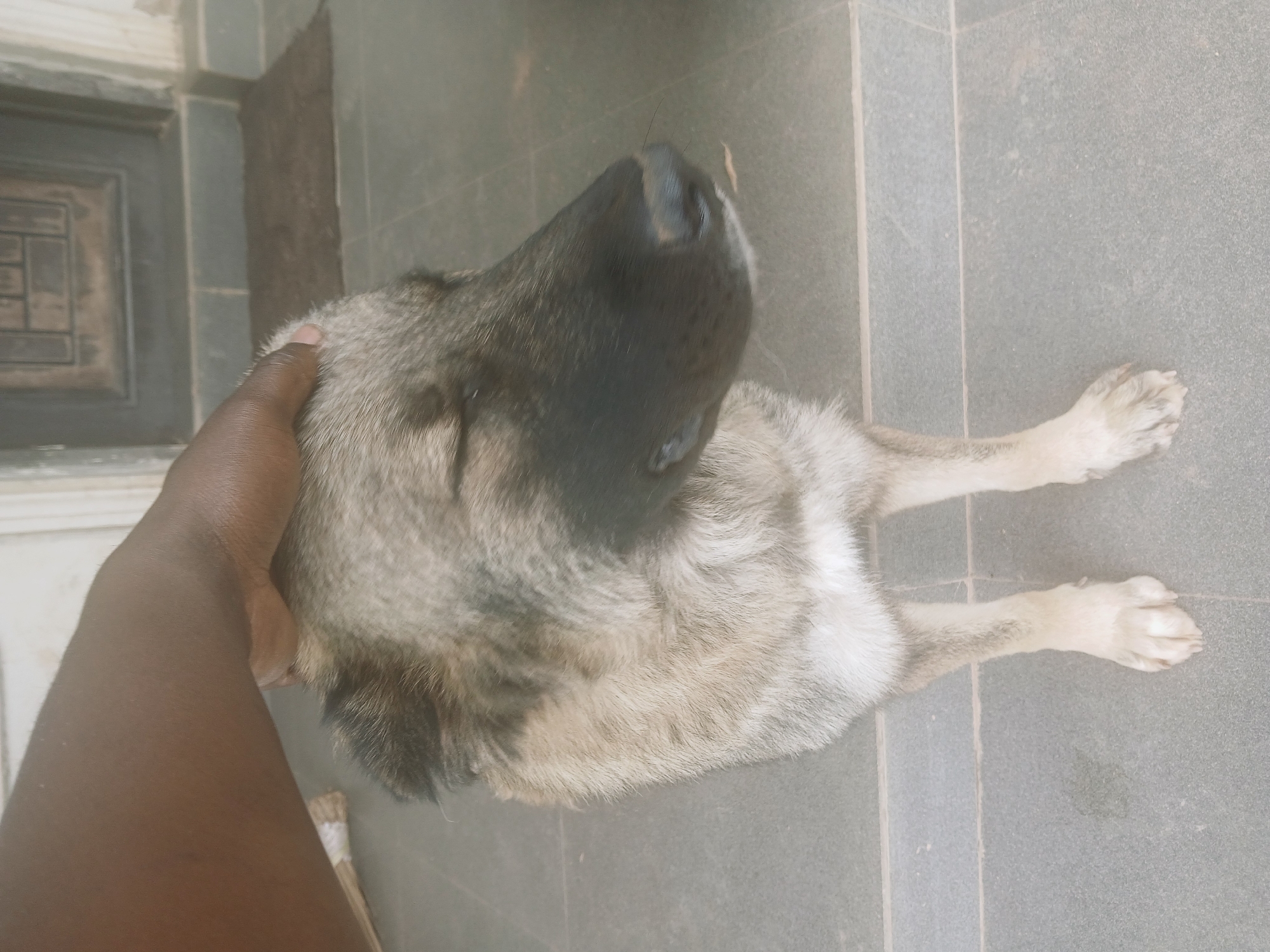A medium-sized, gray and black dog lies on a gray tiled floor in Kitwe, Zambia. A dark-skinned hand rests on the dog's head. The dog is facing away from a door and a partially visible broom.