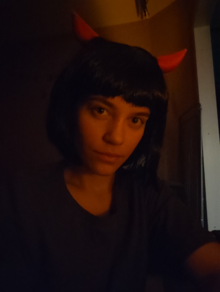 A person with fair skin and light eyes is centered in the frame. They wear a short, dark wig with bangs and small, red devil horns. They are wearing a dark t-shirt. The lighting is dim, casting shadows on their face and clothing. A partially visible white door frame and a dark brown wall are in the background.