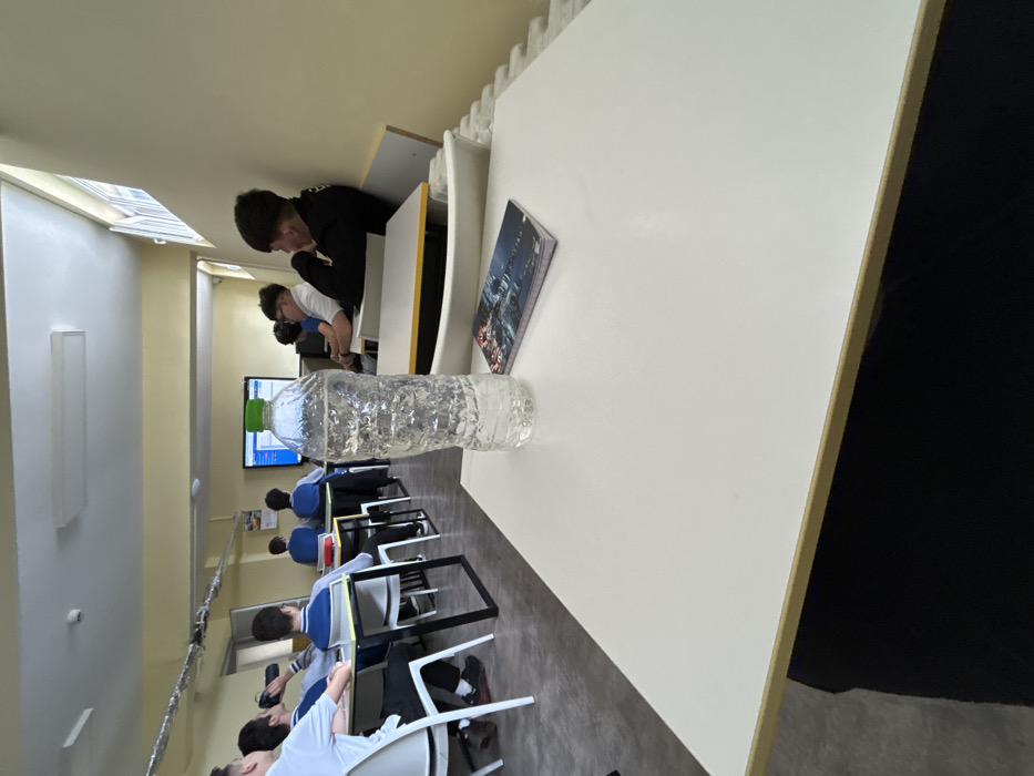 The image depicts a classroom scene, confirmed to be located in Burgas, Bulgaria. The perspective is from a student's desk in the foreground, occupied by a clear plastic water bottle with a green cap, approximately half-filled with water, and a small, dark-covered book or magazine. The classroom features light yellow walls, a white ceiling with rectangular fluorescent light fixtures, and grey flooring. A silver-colored conduit runs along the upper left wall. High windows are visible on the right wall, beneath which a white radiator is installed. At the front of the room, a large flat-screen monitor displays an interface with blue and white elements. Approximately eight male individuals, appearing to be students, are seated at individual desks with white tops and metal frames, arranged in rows. Their attire varies, including white, blue, and black shirts, some displaying uniform-like characteristics such as blue and white striped collars or sleeves. Most students are oriented towards the front of the classroom, presumably engaging with the content displayed on the monitor. One student on the left side of the room is seen drinking from a bottle. Another student on the far right, wearing a black long-sleeved top, is seated facing towards the left side of the room. The scene portrays a class in session.