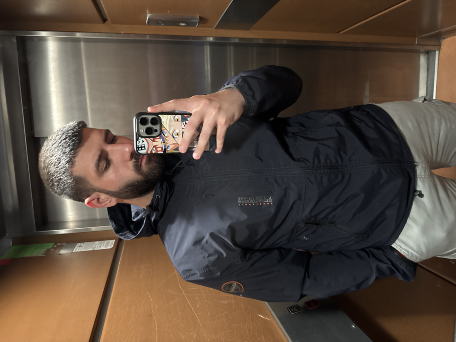 - "An adult male stands centrally within an elevator, captured in a selfie reflection" by FM-S4vFj1, licensed under CC BY 4.0