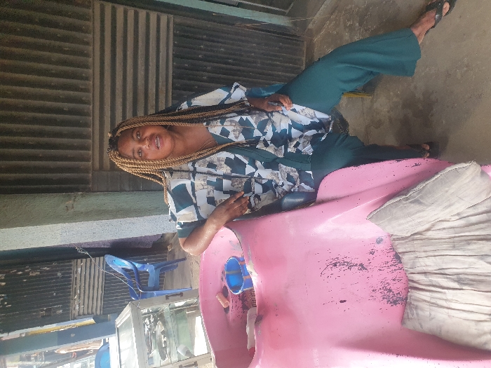 An adult female is depicted seated outdoors in Umuode, Nigeria, facing the viewer directly. She has long, light-brown braided hair extensions and wears a patterned short-sleeved top with dark green wide-leg trousers and black flip-flops. Her right arm rests on the top edge of a large, heavily worn, pink-painted structure, possibly a modified seat or counter, which occupies the left foreground. A small blue bucket rests inside this pink structure, and a grey cushion lies at its base. To the left, a small glass display case with metallic framing is visible, containing indistinct items. In the background, a light blue plastic monobloc chair is present. The environment consists of corrugated metal sheeting forming a wall or gate to the right, a concrete pillar, and other dark barriers, all situated on a concrete ground surface.