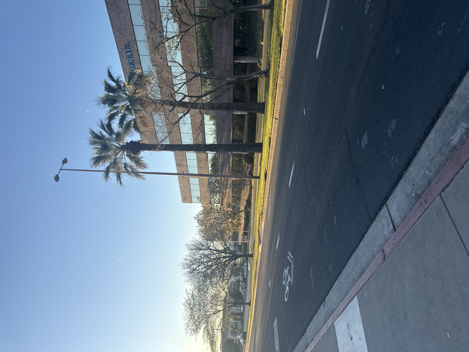 This image depicts a street scene in Glendale, California, specifically near the Federal Building located at 401 W. Colorado St. The scene is illuminated by morning sunlight, originating from the left and casting shadows towards the right, under a clear, light blue sky featuring a faint white airplane contrail in the upper left. In the foreground, a grey concrete sidewalk with a red-painted curb borders a dark asphalt road. The road surface displays minor cracking and patching. White painted road markings include a bicycle lane symbol (a bicycle icon with two parallel lines) and standard lane lines. Adjacent to the road, a strip of manicured green grass separates the thoroughfare from a multi-story commercial building. A tall, dark grey street light pole stands prominently in the midground. Two tall palm trees with green fronds are situated behind the street light and in front of the building. Several deciduous trees, predominantly bare of leaves, are visible along the street and in front of the building to the left of the palm trees. The background features a multi-story commercial building constructed with a brown brick-like facade and numerous reflective windows. The word "FEDERAL" is displayed in blue capital letters on the upper section of the building. To the far left, several parked vehicles are discernible on an adjacent street or in a parking area. No individuals are present within the frame.