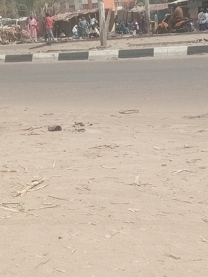The image portrays an outdoor scene in Kawaji, Nigeria, featuring a wide expanse of light brown, dry earth in the foreground. This ground is sparsely covered with light-colored dried plant fragments. In the lower mid-left, a dark, indistinct object and a coiled, circular object are visible on the ground. A grey asphalt road runs horizontally across the mid-ground, delineated by a black and white painted curb. Across the road in the background, a series of structures with thatched roofs and walls constructed from natural materials are visible. Numerous individuals are present in this area. On the far left, two people in pink or red garments and one in a red shirt stand near a partially visible white vehicle. Towards the center and right, multiple individuals are gathered near the structures, some standing, some seated. One person in a brown garment is seated on an orange motorcycle on the right side of the road, where another motorcycle is also present. A utility pole stands beside the road, and a multi-story building with a red roof is discernible in the distant background, to the left of the structures. The sky is a light, hazy grey.
