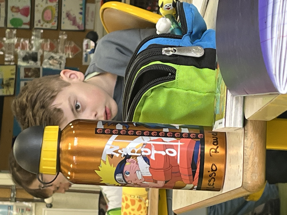 The scene is located in a classroom in La Fouillouse, France. In the midground, a young male child, approximately 7-10 years old, with short brown hair, wearing a grey long-sleeved shirt, is seated at a light-colored wooden desk. He is looking to his right (viewer's left) with a focused gaze. A copper-orange metallic water bottle, with a black domed lid and a yellow plastic collar, stands prominently on the desk in the foreground, partially obscuring the child. The bottle features a graphic of the anime character Naruto Uzumaki in an orange outfit, with the word "NARUTO" printed vertically in white. The name "Alessio Raved" is written in dark script near the base of the bottle. To the right of the water bottle, also on the desk, is a multi-compartment pencil case. It is colored lime green on the left side and royal blue on the right, separated by a black zippered partition. A silver zipper pull is visible on the green section. The blue section is partially open, revealing small white and yellow figures inside. A stack of papers or a thin book lies between the water bottle and the pencil case. A dark-covered notebook is partially visible in the bottom right corner. In the background, a second child, with dark hair and glasses, is partially visible to the left of the main subject, looking downwards, engaged in an activity. A yellow chair back is visible behind the primary male subject. The background wall is covered with numerous children's drawings and artwork, indicating a classroom setting.