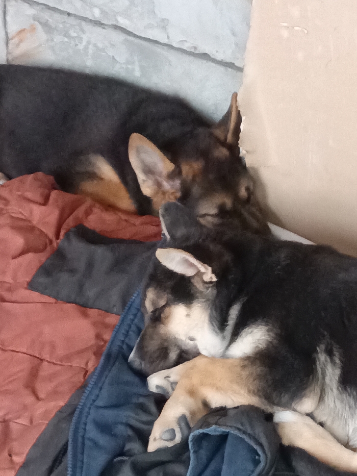 The scene is an interior view in Andreyevo, Russia, featuring two canines at rest. A larger dog, predominantly black with tan markings on its face and ears, occupies the left-to-center background, its head resting and eyes closed. Partially obscuring the first, a second dog, also black and tan with white facial and chest markings, is positioned in the foreground, nestled against the first animal. This second dog's eyes are closed, and its front paws are visible on a dark blue fabric. Both animals appear to be asleep. They are situated on rumpled bedding or clothing: a reddish-brown quilted material is visible on the left, and the dark blue fabric, possibly a jacket, is under the front dog. The background consists of a textured, light grey wall or surface in the upper left and a plain, light beige surface in the upper right.