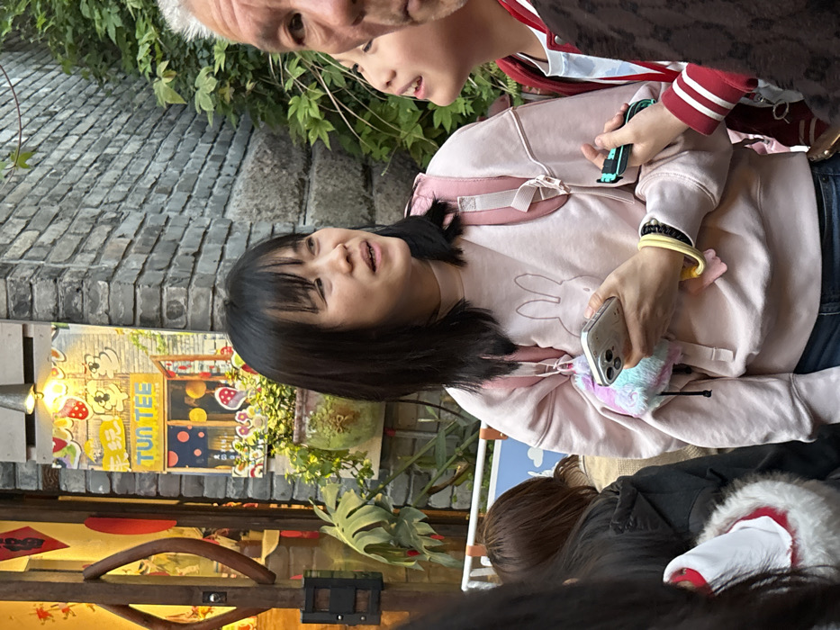 The image depicts a street scene within Nan'an District, China. A central adult female subject, with dark, straight hair and bangs, wears a light pink crewneck sweatshirt featuring a faint rabbit outline, blue jeans, and a pink backpack. She holds a silver smartphone in a clear case, adorned with a multicolored fluffy charm, in her left hand. A yellow elastic band and a dark beaded bracelet are present on her left wrist. Her head is turned slightly to her right, with her mouth slightly open, suggesting she is speaking or listening. To her immediate right, a child's partial face is visible, looking upwards and to the right. The child's left arm, clothed in a red and white striped sleeve, holds a black and teal electronic device. On the far right edge of the frame, the upper right portion of an older male's face, showing light-colored hair and facial lines, is visible. In the background, to the left, a storefront exhibits a yellow wall, a wooden door handle, and a red vertical scroll with a Chinese character. Adjacent to this, a vertical sign is mounted on a grey brick wall; it features a colorful illustration depicting a storefront, two yellow cartoon characters, and the English text "TUN TEE," alongside Chinese characters. Below this sign, a potted green plant is visible. The background further consists of a textured grey brick wall to the right, partially covered with green ivy-like vegetation. A bronze-colored light fixture extends from the wall above the "TUN TEE" sign.