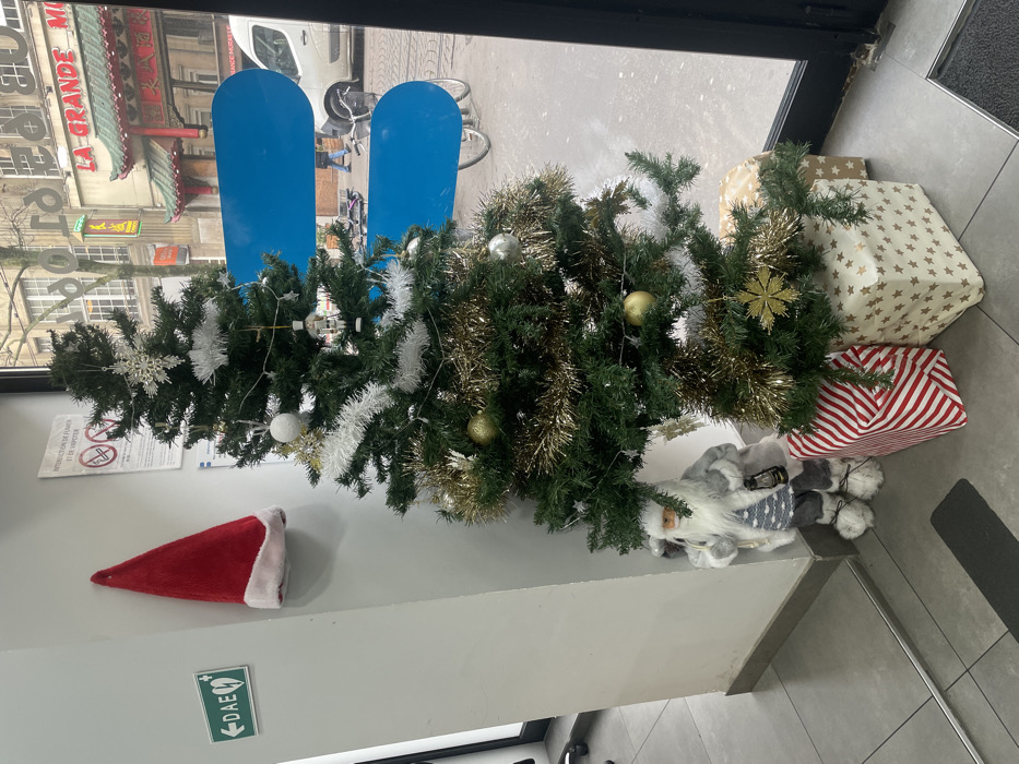 The image displays an indoor space looking out through a glass window or door onto a street scene in Strasbourg, France. The specific location is near the Chinese restaurant "La Grande Muraille," evidenced by a prominent red and green traditional Chinese archway with visible "LA GRANDE MURAILLE" lettering in the background. In the foreground, a decorated artificial Christmas tree stands centrally, adorned with green tinsel, white tinsel, gold and silver baubles, and gold snowflake ornaments. At the base of the tree are three wrapped gift boxes: one with red and white stripes and two with a light background patterned with gold stars. To the left of the tree, a Santa Claus figurine, dressed in grey and white, holds a small dark lantern. On the light grey wall to the left of the tree, a red Santa hat with a white brim hangs. Below it, a green rectangular sign marked "DAE" with a white heart symbol and an arrow pointing left is affixed. A white poster displaying "INTERDICTION DE FUMER ET DE VAPOTER" (No Smoking and Vaping) in French is visible higher on the wall. The floor is covered with large grey rectangular tiles. The external street view reveals the Chinese archway, a pedestrian walking, a white commercial van, and two bicycles parked. Two large, horizontal, blue, rounded panels partially obstruct the view through the window. The sky appears overcast.