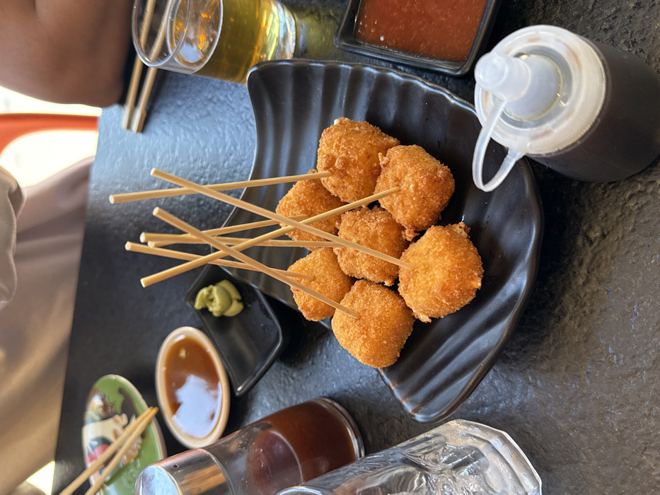 - "The image displays a black plate filled with skewers of golden-brown, fried balls, possibly mozzarella or potato" by FM-6aVsN2, licensed under CC BY 4.0