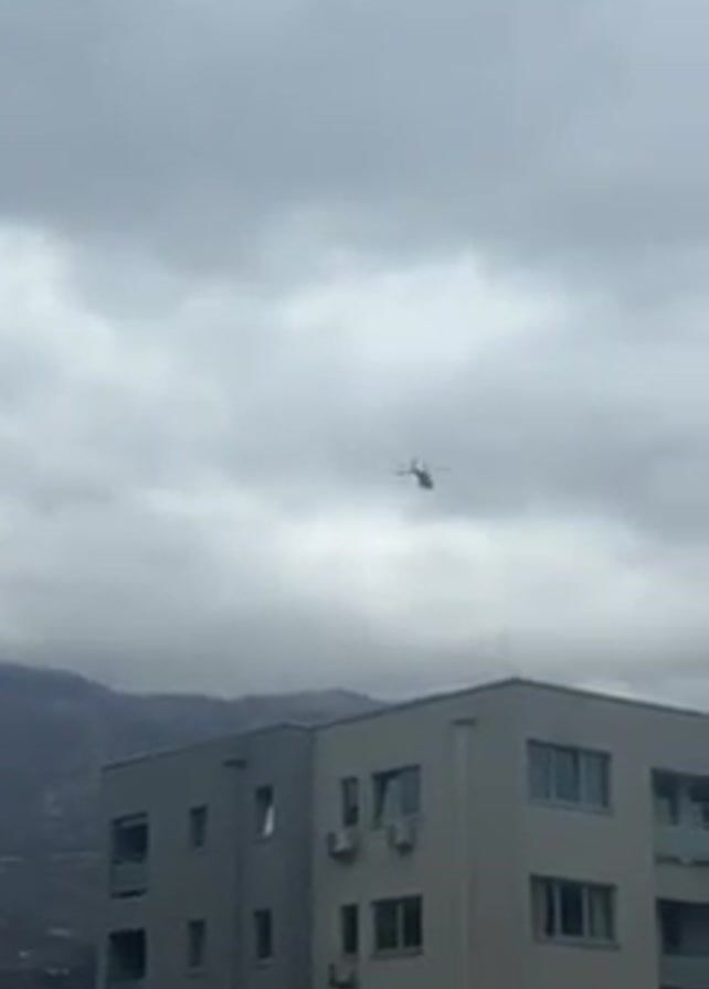 The video depicts a helicopter flying in a cloudy sky. The helicopter appears distant and small against the overcast sky. In the foreground is a light-colored, modern apartment building with multiple windows and air conditioning units mounted on its exterior walls. Behind the building, a mountain range can be seen, blending into the background due to the cloudy weather. The scene appears to be shot from a slightly elevated position, possibly from another building.
