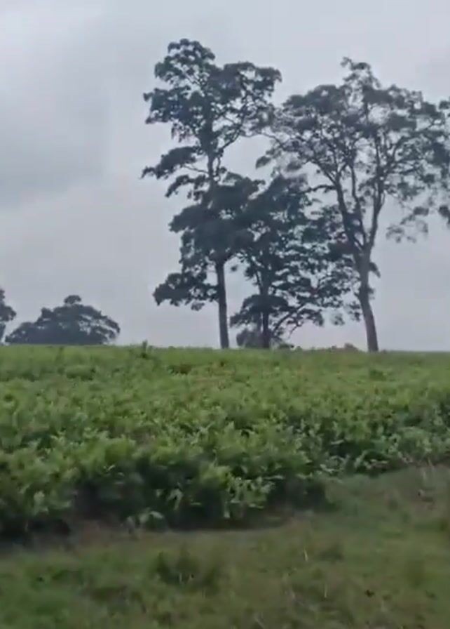 field of low-lying green plants under an overcast sky. Several tall, dark-colored trees are visible on the horizon behind the field. The video appears to be taken from a moving vehicle.
