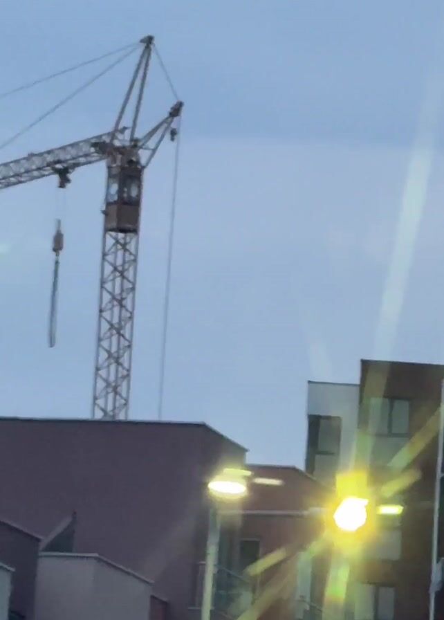 The video begins with a shot of a construction crane against a cloudy sky